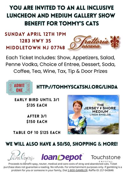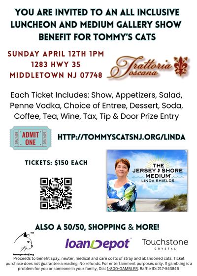 This all inclusive luncheon and medium gallery show is a day of fun and amazing food and wine while raising funds to help stray and abandoned cats in the Holmdel, Middletown, Keansburg areas of NJ.